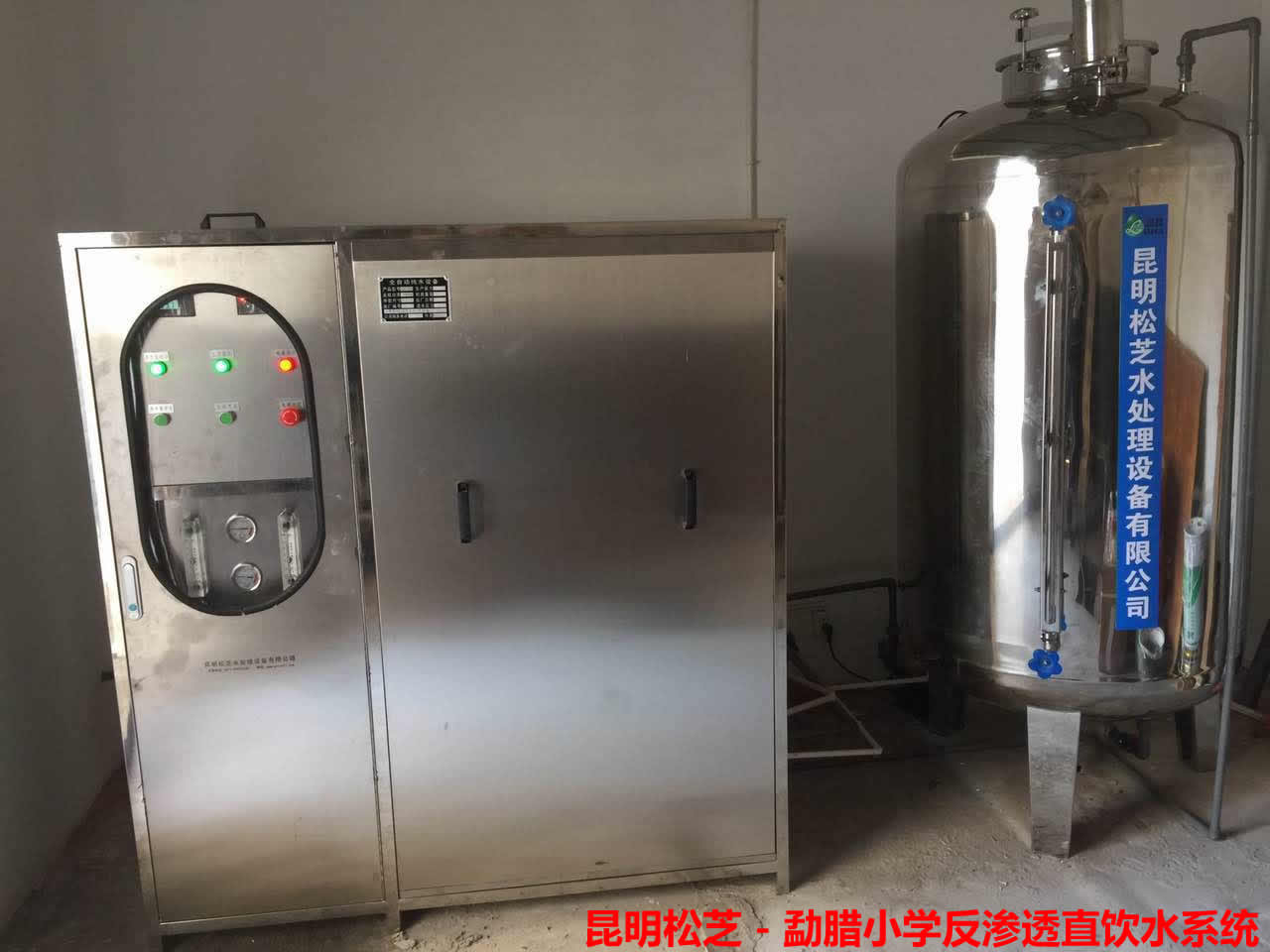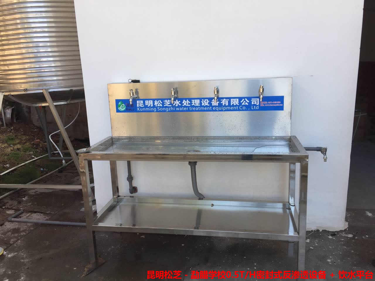 勐臘學(xué)校密封式0.5T/H反滲透設(shè)備 + 預(yù)處理系統(tǒng) + 飲水平臺